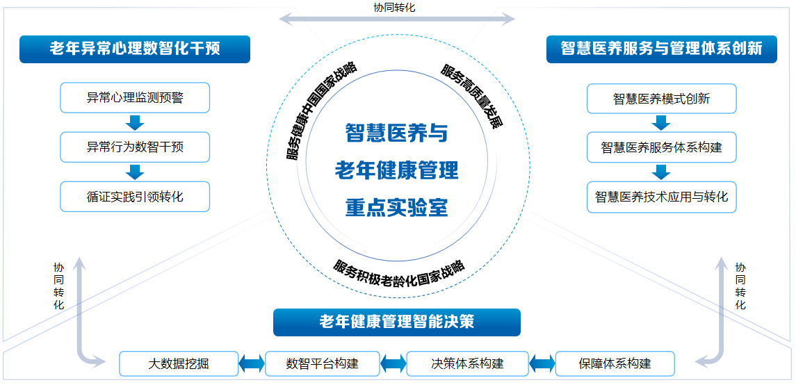 其中,老年健康管理智能决策基于四川省老龄化现状,致力于运用数字化、智能化信息技术和手段探索医养服务领域优化、革新的策略与路径,构建基于数字技术和智能技术的老年健康管理理论、老年人慢病共病管理的策略等,为全方位多元化的老年健康服务决策提供研究证据和理论支撑。老年异常心理数智化干预主要聚焦老年人群抑郁、焦虑、孤独等异常心理和行为问题,通过干预实验研究、智慧平台研发,开展原创性、系统性的基础研究与应用转化研究,旨在通过数智化策略改善老年人群心理健康状况、降低各种不良心理结局发生率并提高老年人群生命质量。智慧医养服务与管理体系创新致力于有效地融合云计算、物联网、人工智能等尖端技术,为老年人全方位的健康管理和个性化医养服务提供强有力的支撑。